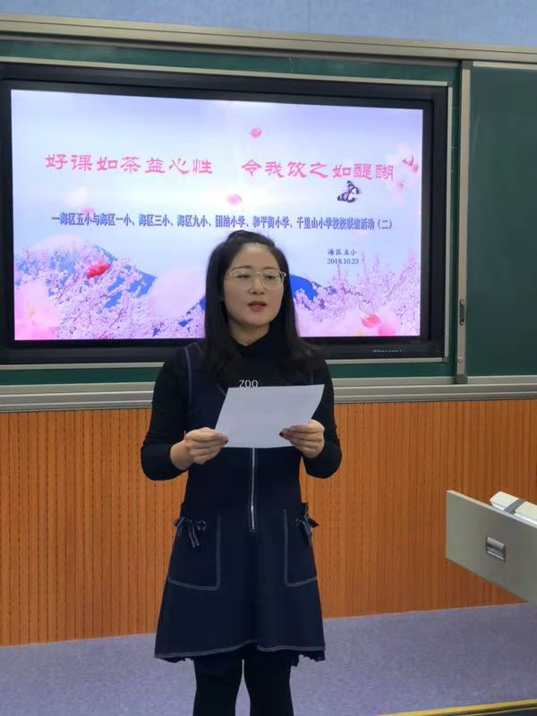 2018年10月23日,海区五小举行了“好课如茶益心性 令我饮之如醍醐——海区五小‘点点对对名师带我教’系列活动(二)”。有幸再次邀请到海勃湾区教研室的教研员王玲玲老师进行名师课例赏析。此次活动还吸引了和平街小学、海区一小、海区三小、海区九小、团结小学、千里山小学的专家共20多名老师前来参加。