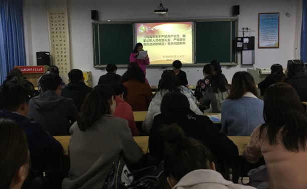 秦丽娟书记带领全体教职工学习了文件,并结合教育系统行业特点和日常报备发现的问题及当前市区两级所查处的违反此规定的案例,有针对性地对相关规定进行强调说明。