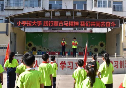 本次活动中,海区五小还邀请到了援鄂英雄——毕晓波女士,她不仅是一名救死扶伤的白衣天使,更是一年级八班张子烨同学的母亲。母子俩一起上台为全体师生讲述了支援武汉期间发生的故事。母子俩几度声音哽咽,队员们也纷纷湿了眼眶,用一张张饱含敬佩的稚嫩面庞望着这一对母子,随着故事分享接近尾声,队员们的掌声一浪高过一浪。队员们明白,要向这样的好榜样学习“吃苦耐劳、一往无前、不达目的决不罢休”的蒙古马精神。