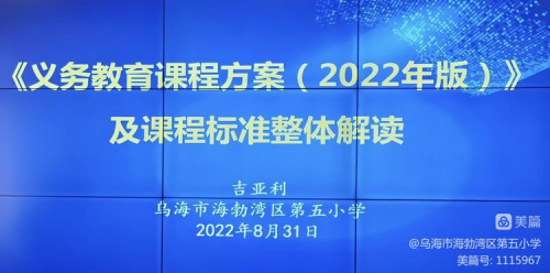 时序更替,华章日新。为了深入贯彻新课程标准精神,帮助教师全面理解、深入领会新课程标准的基本理念,准确把握教材的编写原则、结构体系与编排思路,为今后的教学指明方向,2022831日,海勃湾区第五小学举行了2022年版义务教育课程方案与课程标准的培训活动。
