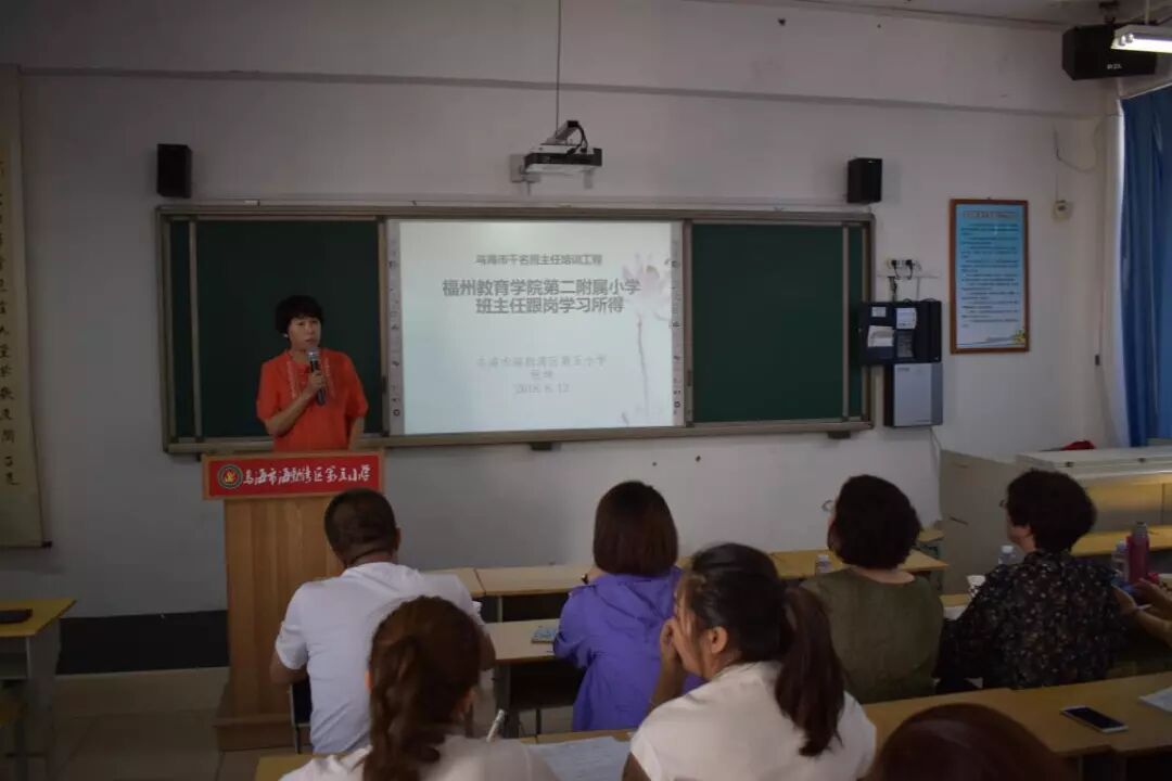 乌海市2018年千名班主任培训工程中,海区五小有5名班主任参加培训活动,她们深入教学一线,详细了解跟岗学校教学和管理工作,带着问题和带岗班主任深入沟通、交流和研讨。通过跟岗培训,学员们从中学到了许多好的经验和做法。在交流汇报中王亚萍、张坤、张咏玲、于焱、毕玉婵老师对跟岗学校文化建构、校本研修、班队会设计、班主任培养和团队建设、德育教育工作开展等方面阐述了自己的认识和体会。