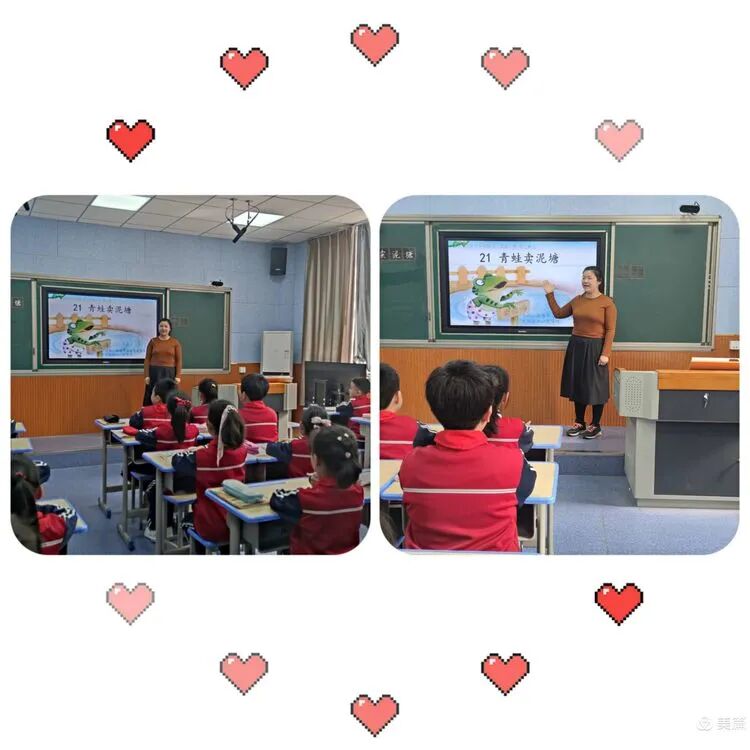 第三节课吴萍丽老师执教的统编版二年级下册第七单元第21课《青蛙卖泥塘》,在教学中,教师利用色彩鲜明的动物头饰,吸引了孩子们的注意力,调动了课堂氛围,让孩子们把这个故事演了出来,使学生们印象深刻。