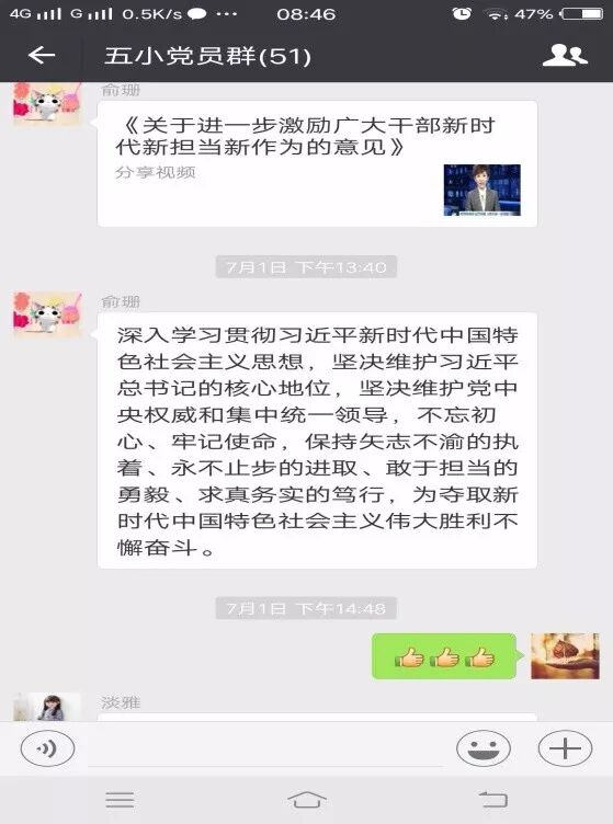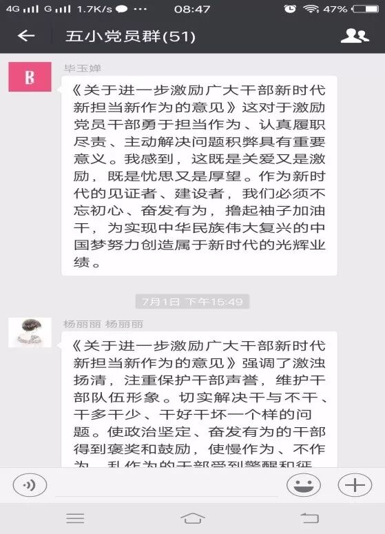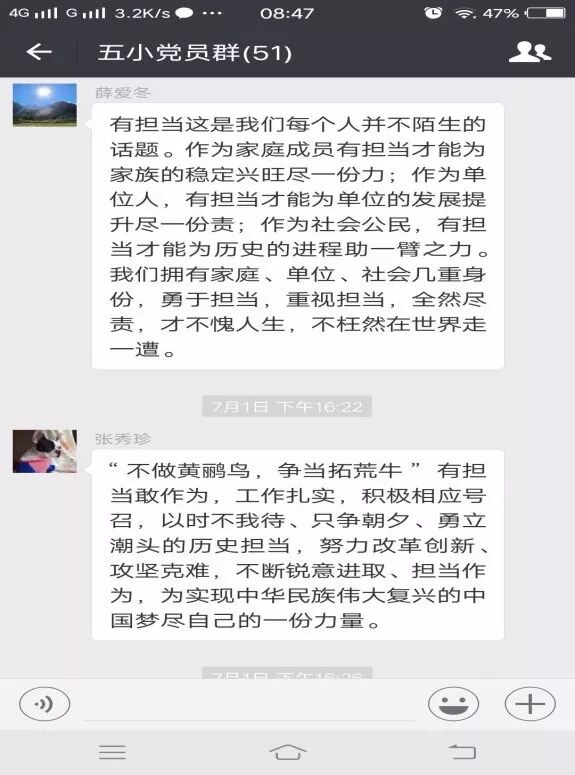 7月1日,一接到上级教育部门的学习通知,我们立刻将学习内容发布在学校党员微信群和教师微信群中,组织老师们在线上学习,并积极讨论。尤其是党员教师,结合各自的工作岗位,认真学习的同时纷纷发表学习感受,并表示在工作中要勇于落实使命担当。