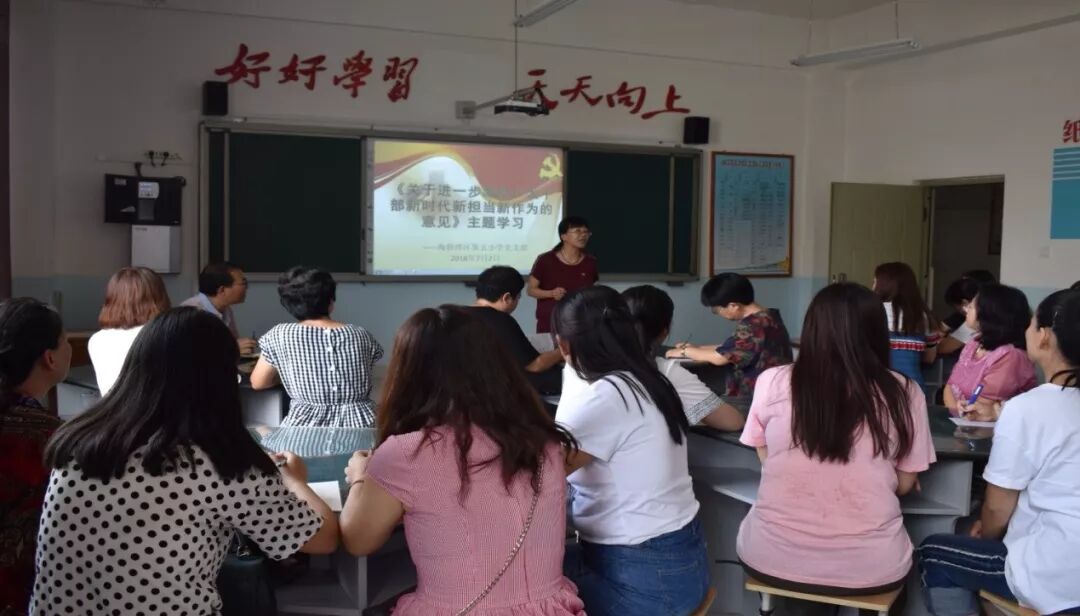 (图为五小党支部组织党员和教师集中学习《意见》精神)