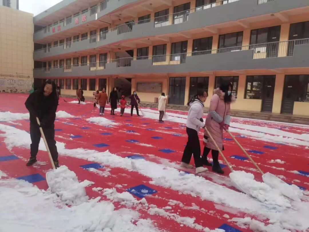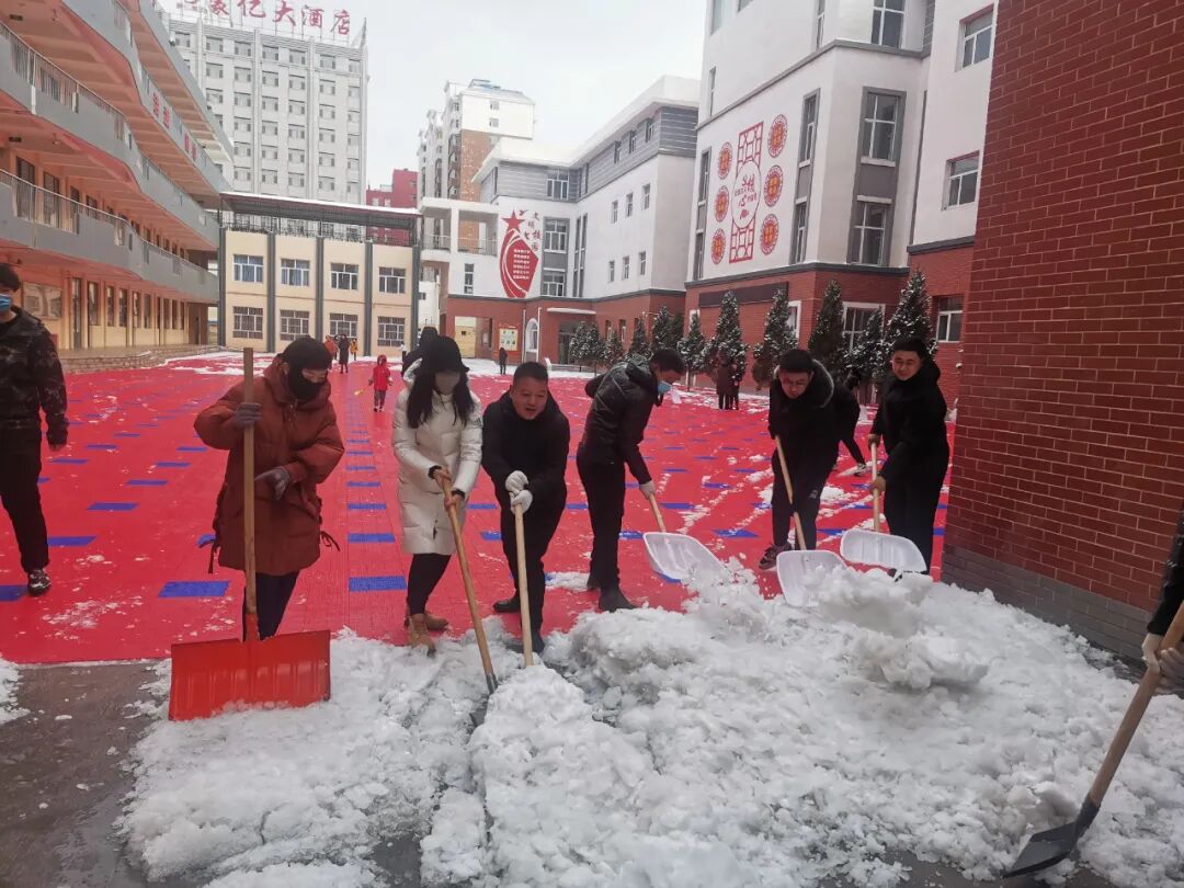 在老师们的齐心协力下,学校的主干道渐渐从积雪中露出了原貌,有效保障了广大师生的出行安全,保障了学校各项教学工作的正常进行。老师们的手有的冻得通红,但他们依然精神抖擞,不言辛苦,冒着严寒继续铲雪。老师们劳动的身影,成为校园中一道亮丽的风景线。